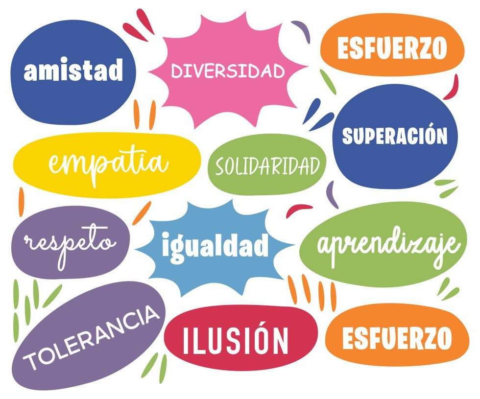 Circuito de piso con palabras positivas como amistad, respeto y empatía. Diseñado para fomentar valores mientras los niños juegan y se mueven.